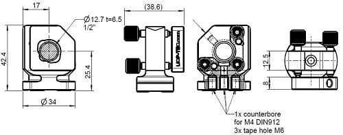 As with all our mirror mount series there is the option of using the adjuster head or an Allen key for fine adjustments of the mirror mount. The mirror mount is available with 2 or 3 adjusters, the 3-adjuster option enabling precise horizontal positioning of the optic. Very precise adjustment of your optical component is possible because of the 170TPI (turns per inch) screw threads.